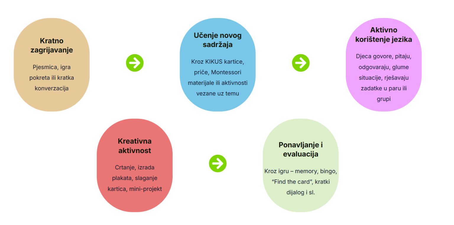 Kroz ove aktivnosti djeca spontano usvajaju vokabular, izgovor, osnovne gramatičke strukture i razvijaju pozitivnu povezanost s jezikom.
